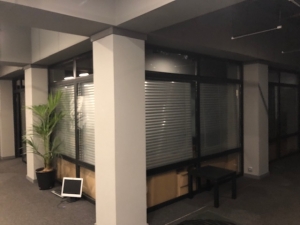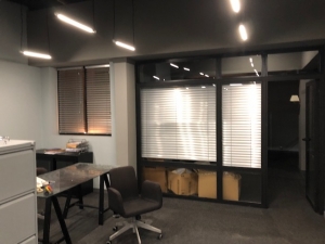 Uma divisória em alumínio, madeira e vidro.