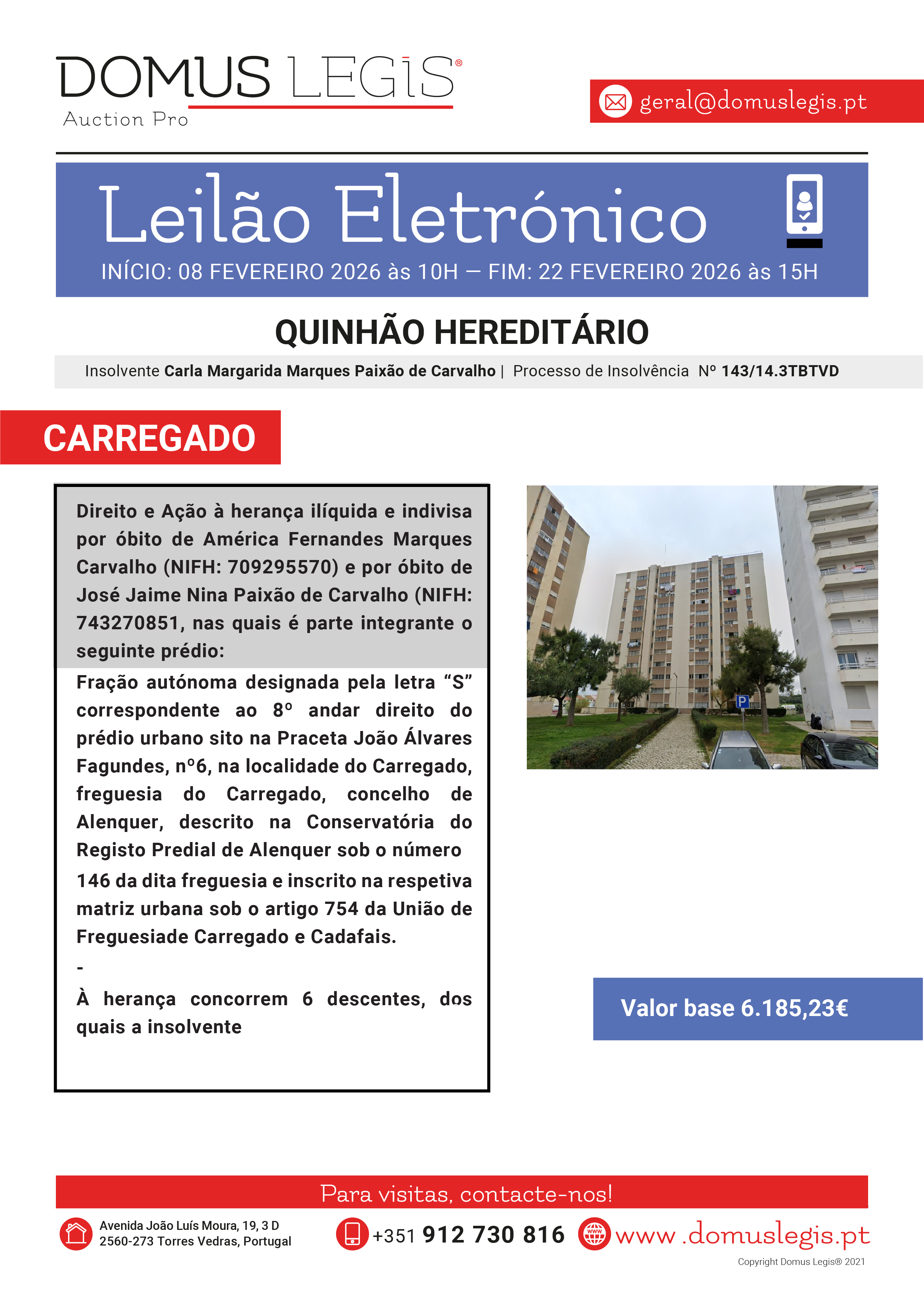 Direito e Ação à herança ilíquida e indivisa por óbito de América Fernandes Marques Carvalho (NIFH: 709295570) e por óbito de José Jaime Nina Paixão de Carvalho (NIFH: 743270851, nas quais é parte integrante o seguinte prédio: Fração autónoma designada pela letra “S” correspondente ao 8º andar direito do prédio urbano sito na Praceta João Álvares Fagundes, nº6, na localidade do Carregado, freguesia do Carregado, concelho de Alenquer, descrito na Conservatória do Registo Predial de Alenquer sob o número 146 da dita freguesia e inscrito na respetiva matriz urbana sob o artigo 754 da União de Freguesia de Carregado e Cadafais. - À herança concorrem 6 descentes, dos quais a insolvente.
