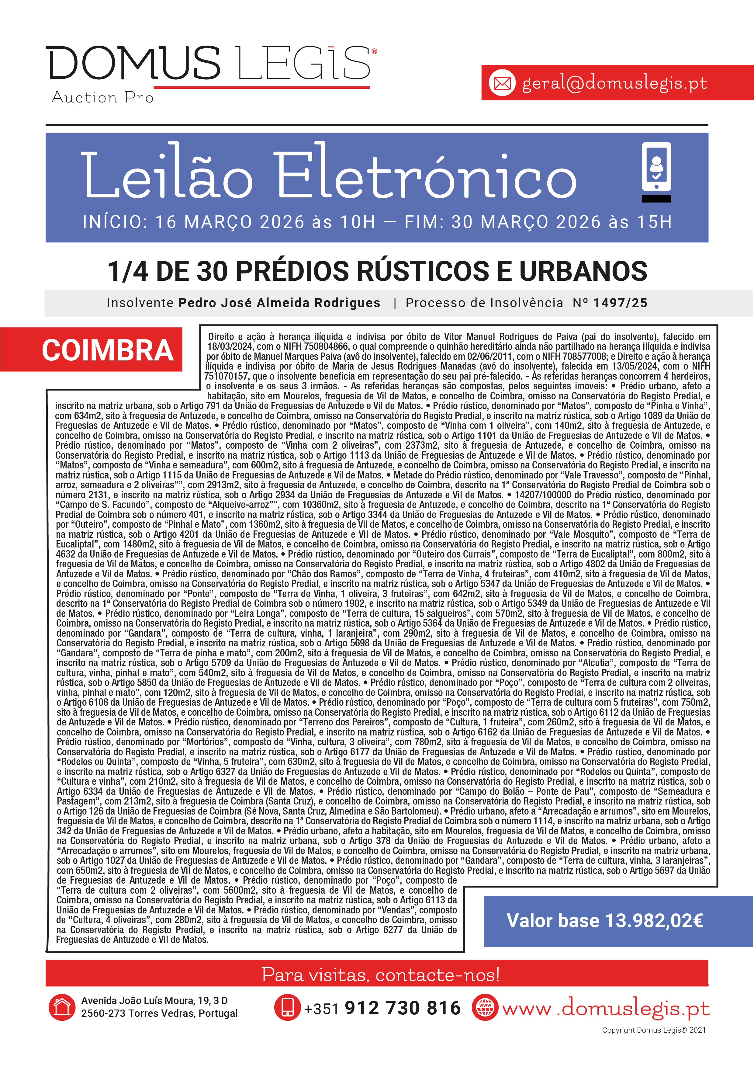 Direito e ação à herança ilíquida e indivisa por óbito de Vitor Manuel Rodrigues de Paiva (pai do insolvente), falecido em 18/03/2024, com o NIFH 750804866, o qual compreende o quinhão hereditário ainda não partilhado na herança ilíquida e indivisa por óbito de Manuel Marques Paiva (avô do insolvente), falecido em 02/06/2011, com o NIFH 708577008; e Direito e ação à herança ilíquida e indivisa por óbito de Maria de Jesus Rodrigues Manadas (avó do insolvente), falecida em 13/05/2024, com o NIFH 751070157, que o insolvente beneficia em representação do seu pai pré-falecido. - Às referidas heranças concorrem 4 herdeiros, o insolvente e os seus 3 irmãos. - As referidas heranças são compostas, pelos seguintes imoveis: • Prédio urbano, afeto a habitação, sito em Mourelos, freguesia de Vil de Matos, e concelho de Coimbra, omisso na Conservatória do Registo Predial, e inscrito na matriz urbana, sob o Artigo 791 da União de Freguesias de Antuzede e Vil de Matos. • Prédio rústico, denominado por “Matos”, composto de “Pinha e Vinha”, com 634m2, sito à freguesia de Antuzede, e concelho de Coimbra, omisso na Conservatória do Registo Predial, e inscrito na matriz rústica, sob o Artigo 1089 da União de Freguesias de Antuzede e Vil de Matos. • Prédio rústico, denominado por “Matos”, composto de “Vinha com 1 oliveira”, com 140m2, sito à freguesia de Antuzede, e concelho de Coimbra, omisso na Conservatória do Registo Predial, e inscrito na matriz rústica, sob o Artigo 1101 da União de Freguesias de Antuzede e Vil de Matos. • Prédio rústico, denominado por “Matos”, composto de “Vinha com 2 oliveiras”, com 2373m2, sito à freguesia de Antuzede, e concelho de Coimbra, omisso na Conservatória do Registo Predial, e inscrito na matriz rústica, sob o Artigo 1113 da União de Freguesias de Antuzede e Vil de Matos. • Prédio rústico, denominado por “Matos”, composto de “Vinha e semeadura”, com 600m2, sito à freguesia de Antuzede, e concelho de Coimbra, omisso na Conservatória do Registo Predial, e inscrito na matriz rústica, sob o Artigo 1115 da União de Freguesias de Antuzede e Vil de Matos. • Metade do Prédio rústico, denominado por “Vale Travesso”, composto de “Pinhal, arroz, semeadura e 2 oliveiras””, com 2913m2, sito à freguesia de Antuzede, e concelho de Coimbra, descrito na 1ª Conservatória do Registo Predial de Coimbra sob o número 2131, e inscrito na matriz rústica, sob o Artigo 2934 da União de Freguesias de Antuzede e Vil de Matos. • 14207/100000 do Prédio rústico, denominado por “Campo de S. Facundo”, composto de “Alqueive-arroz””, com 10360m2, sito à freguesia de Antuzede, e concelho de Coimbra, descrito na 1ª Conservatória do Registo Predial de Coimbra sob o número 401, e inscrito na matriz rústica, sob o Artigo 3344 da União de Freguesias de Antuzede e Vil de Matos. • Prédio rústico, denominado por “Outeiro”, composto de “Pinhal e Mato”, com 1360m2, sito à freguesia de Vil de Matos, e concelho de Coimbra, omisso na Conservatória do Registo Predial, e inscrito na matriz rústica, sob o Artigo 4201 da União de Freguesias de Antuzede e Vil de Matos. • Prédio rústico, denominado por “Vale Mosquito”, composto de “Terra de Eucaliptal”, com 1480m2, sito à freguesia de Vil de Matos, e concelho de Coimbra, omisso na Conservatória do Registo Predial, e inscrito na matriz rústica, sob o Artigo 4632 da União de Freguesias de Antuzede e Vil de Matos. • Prédio rústico, denominado por “Outeiro dos Currais”, composto de “Terra de Eucaliptal”, com 800m2, sito à freguesia de Vil de Matos, e concelho de Coimbra, omisso na Conservatória do Registo Predial, e inscrito na matriz rústica, sob o Artigo 4802 da União de Freguesias de Antuzede e Vil de Matos. • Prédio rústico, denominado por “Chão dos Ramos”, composto de “Terra de Vinha, 4 fruteiras”, com 410m2, sito à freguesia de Vil de Matos, e concelho de Coimbra, omisso na Conservatória do Registo Predial, e inscrito na matriz rústica, sob o Artigo 5347 da União de Freguesias de Antuzede e Vil de Matos. • Prédio rústico, denominado por “Ponte”, composto de “Terra de Vinha, 1 oliveira, 3 fruteiras”, com 642m2, sito à freguesia de Vil de Matos, e concelho de Coimbra, descrito na 1ª Conservatória do Registo Predial de Coimbra sob o número 1902, e inscrito na matriz rústica, sob o Artigo 5349 da União de Freguesias de Antuzede e Vil de Matos. • Prédio rústico, denominado por “Leira Longa”, composto de “Terra de cultura, 15 salgueiros”, com 570m2, sito à freguesia de Vil de Matos, e concelho de Coimbra, omisso na Conservatória do Registo Predial, e inscrito na matriz rústica, sob o Artigo 5364 da União de Freguesias de Antuzede e Vil de Matos. • Prédio rústico, denominado por “Gandara”, composto de “Terra de cultura, vinha, 1 laranjeira”, com 290m2, sito à freguesia de Vil de Matos, e concelho de Coimbra, omisso na Conservatória do Registo Predial, e inscrito na matriz rústica, sob o Artigo 5698 da União de Freguesias de Antuzede e Vil de Matos. • Prédio rústico, denominado por “Gandara”, composto de “Terra de pinha e mato”, com 200m2, sito à freguesia de Vil de Matos, e concelho de Coimbra, omisso na Conservatória do Registo Predial, e inscrito na matriz rústica, sob o Artigo 5709 da União de Freguesias de Antuzede e Vil de Matos. • Prédio rústico, denominado por “Alcutia”, composto de “Terra de cultura, vinha, pinhal e mato”, com 540m2, sito à freguesia de Vil de Matos, e concelho de Coimbra, omisso na Conservatória do Registo Predial, e inscrito na matriz rústica, sob o Artigo 5850 da União de Freguesias de Antuzede e Vil de Matos. • Prédio rústico, denominado por “Poço”, composto de “Terra de cultura com 2 oliveiras, vinha, pinhal e mato”, com 120m2, sito à freguesia de Vil de Mat