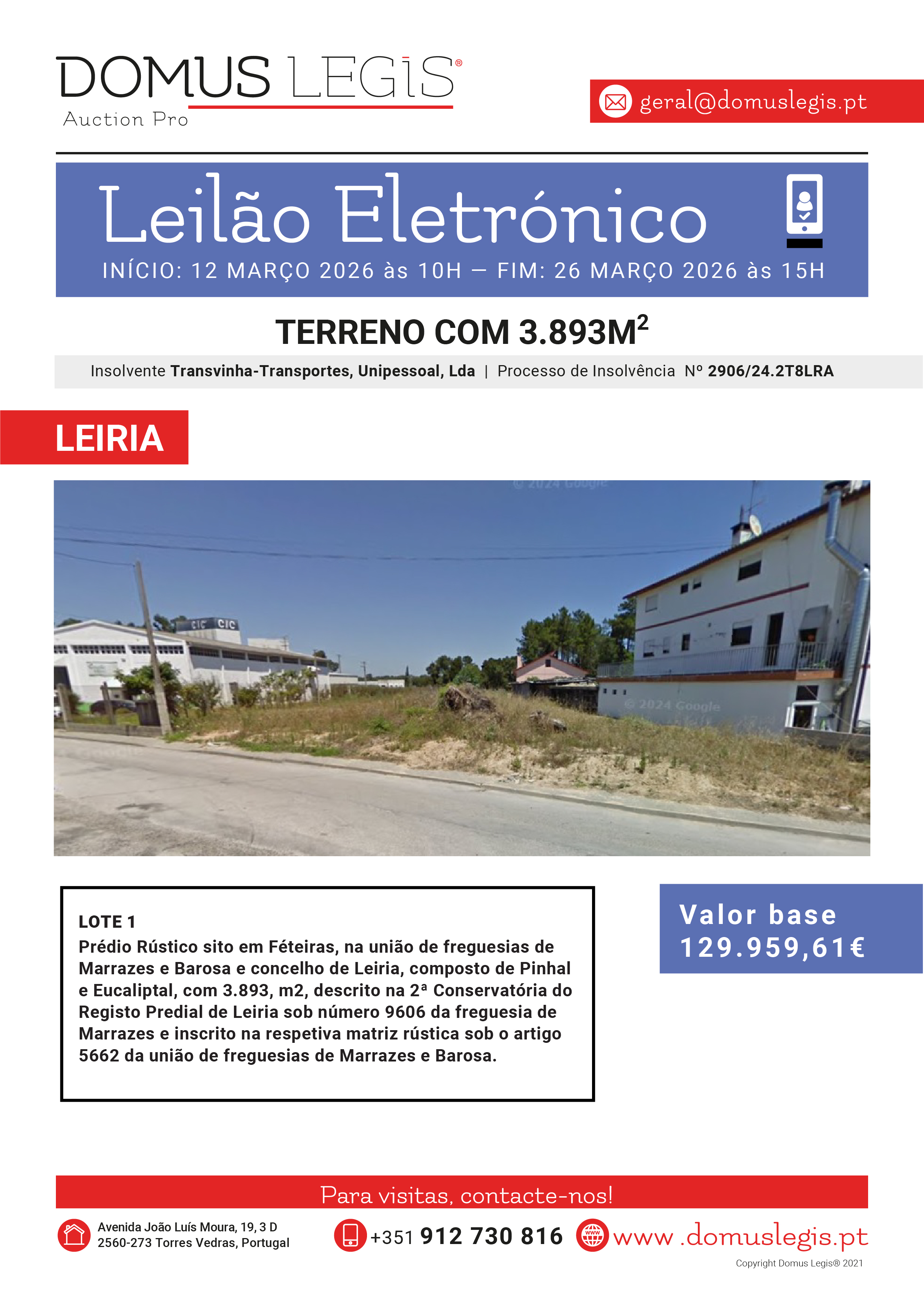Prédio Rústico sito em Féteiras, na união de freguesias de Marrazes e Barosa e concelho de Leiria, composto de Pinhal e Eucaliptal, com 3.893, m2, descrito na 2ª Conservatória do Registo Predial de Leiria sob número 9606 da freguesia de Marrazes e inscrito na respetiva matriz rústica sob o artigo 5662 da união de freguesias de Marrazes e Barosa.