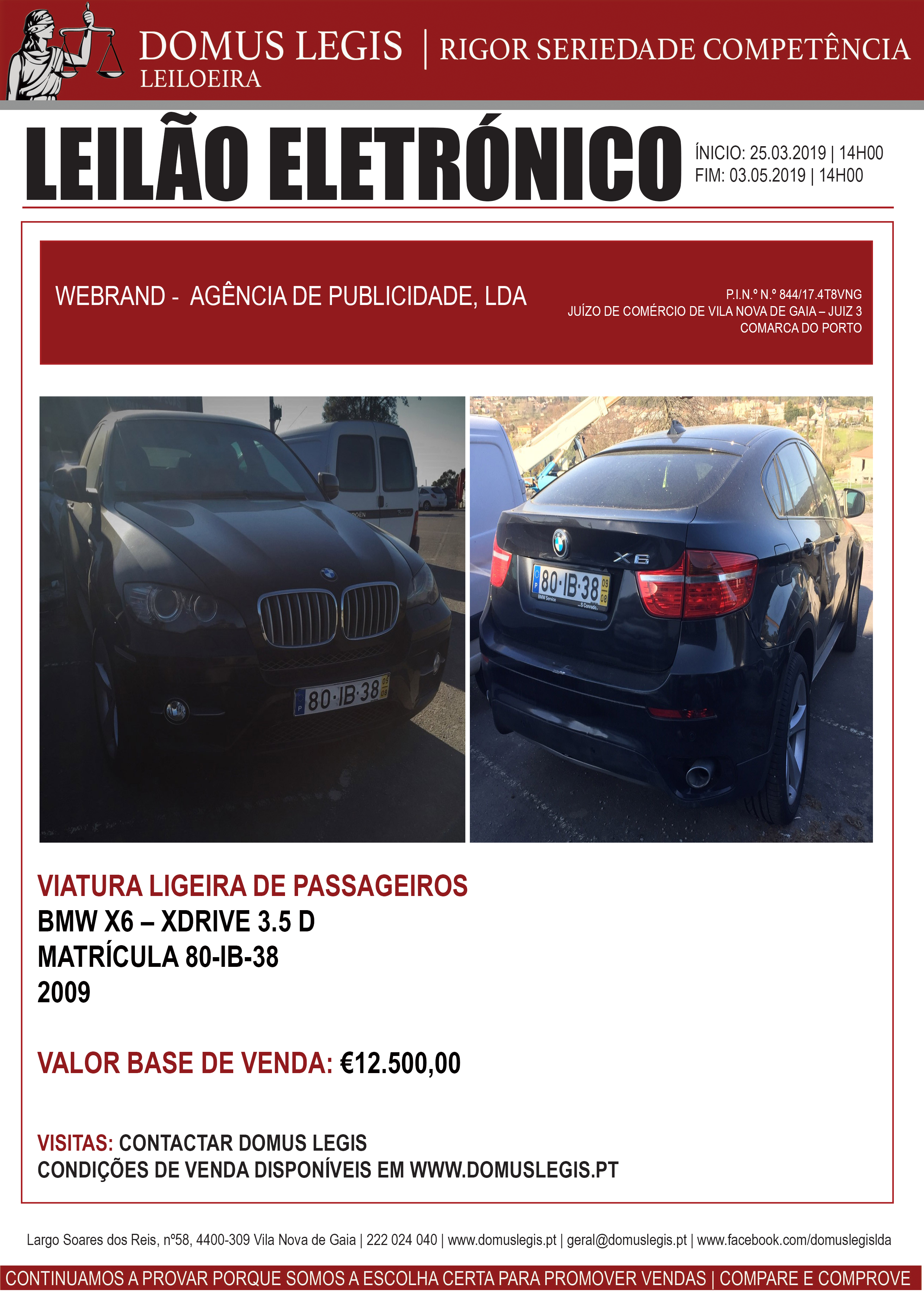 Viatura ligeira de passageiros, da marca BMW, modelo X6 – XDrive 3.5 D, a diesel, de cor preta, do ano de 2009, com matricula 80-IB-38, com 238899 kms