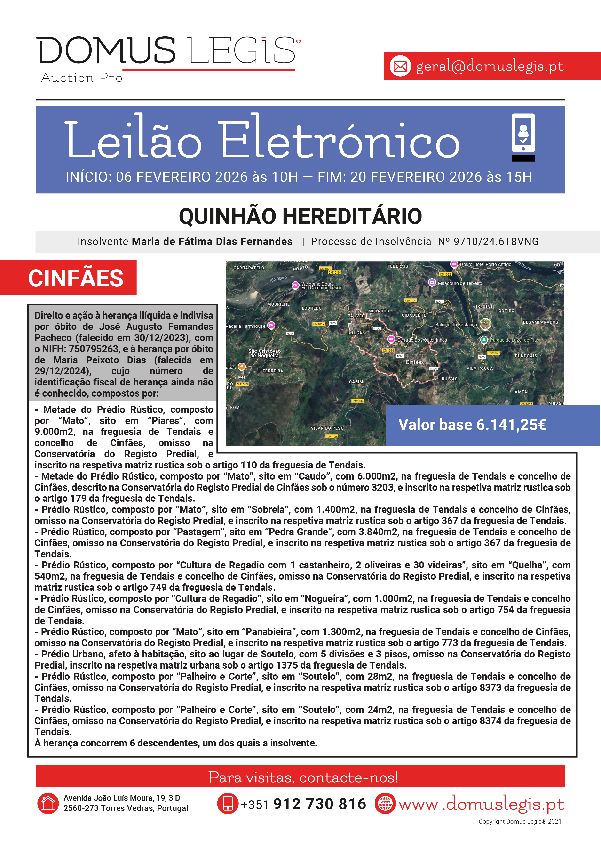 Direito e ação à herança ilíquida e indivisa por óbito de José Augusto Fernandes Pacheco (falecido em 30/12/2023), com o NIFH: 750795263, e à herança por óbito de Maria Peixoto Dias (falecida em 29/12/2024), com NIFH: 751766640, compostos por: - Metade do Prédio Rústico, composto por “Mato”, sito em “Piares”, com 9.000m2, na freguesia de Tendais e concelho de Cinfães, omisso na Conservatória do Registo Predial, e inscrito na respetiva matriz rustica sob o artigo 110 da freguesia de Tendais. - Metade do Prédio Rústico, composto por “Mato”, sito em “Caudo”, com 6.000m2, na freguesia de Tendais e concelho de Cinfães, descrito na Conservatória do Registo Predial de Cinfães sob o número 3203, e inscrito na respetiva matriz rustica sob o artigo 179 da freguesia de Tendais. - Prédio Rústico, composto por “Mato”, sito em “Sobreia”, com 1.400m2, na freguesia de Tendais e concelho de Cinfães, omisso na Conservatória do Registo Predial, e inscrito na respetiva matriz rustica sob o artigo 367 da freguesia de Tendais. - Prédio Rústico, composto por “Pastagem”, sito em “Pedra Grande”, com 3.840m2, na freguesia de Tendais e concelho de Cinfães, omisso na Conservatória do Registo Predial, e inscrito na respetiva matriz rustica sob o artigo 367 da freguesia de Tendais. - Prédio Rústico, composto por “Cultura de Regadio com 1 castanheiro, 2 oliveiras e 30 videiras”, sito em “Quelha”, com 540m2, na freguesia de Tendais e concelho de Cinfães, omisso na Conservatória do Registo Predial, e inscrito na respetiva matriz rustica sob o artigo 749 da freguesia de Tendais. - Prédio Rústico, composto por “Cultura de Regadio”, sito em “Nogueira”, com 1.000m2, na freguesia de Tendais e concelho de Cinfães, omisso na Conservatória do Registo Predial, e inscrito na respetiva matriz rustica sob o artigo 754 da freguesia de Tendais. - Prédio Rústico, composto por “Mato”, sito em “Panabieira”, com 1.300m2, na freguesia de Tendais e concelho de Cinfães, omisso na Conservatória do Registo Predial, e inscrito na respetiva matriz rustica sob o artigo 773 da freguesia de Tendais. - Prédio Urbano, afeto à habitação, sito ao lugar de Soutelo, com 5 divisões e 3 pisos, omisso na Conservatória do Registo Predial, inscrito na respetiva matriz urbana sob o artigo 1375 da freguesia de Tendais. - Prédio Rústico, composto por “Palheiro e Corte”, sito em “Soutelo”, com 28m2, na freguesia de Tendais e concelho de Cinfães, omisso na Conservatória do Registo Predial, e inscrito na respetiva matriz rustica sob o artigo 8373 da freguesia de Tendais. - Prédio Rústico, composto por “Palheiro e Corte”, sito em “Soutelo”, com 24m2, na freguesia de Tendais e concelho de Cinfães, omisso na Conservatória do Registo Predial, e inscrito na respetiva matriz rustica sob o artigo 8374 da freguesia de Tendais. À herança concorrem 6 descendentes, um dos quais a insolvente.