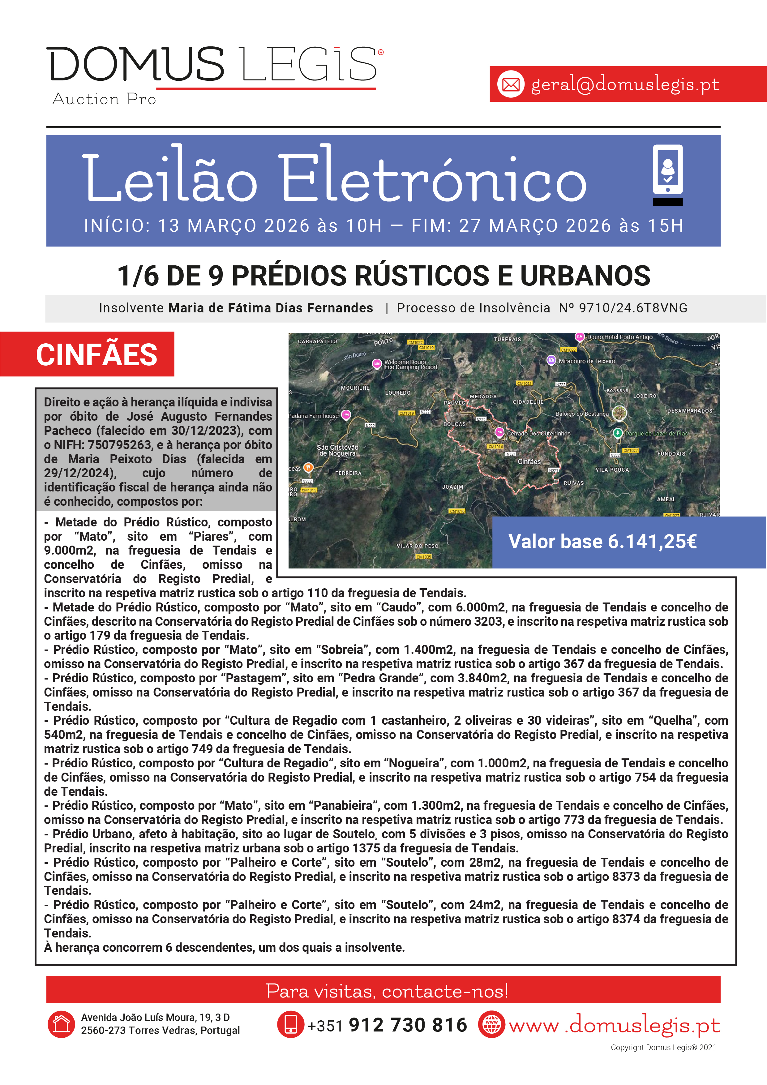 Direito e ação à herança ilíquida e indivisa por óbito de José Augusto Fernandes Pacheco (falecido em 30/12/2023), com o NIFH: 750795263, e à herança por óbito de Maria Peixoto Dias (falecida em 29/12/2024), com NIFH: 751766640, compostos por: - Metade do Prédio Rústico, composto por “Mato”, sito em “Piares”, com 9.000m2, na freguesia de Tendais e concelho de Cinfães, omisso na Conservatória do Registo Predial, e inscrito na respetiva matriz rustica sob o artigo 110 da freguesia de Tendais. - Metade do Prédio Rústico, composto por “Mato”, sito em “Caudo”, com 6.000m2, na freguesia de Tendais e concelho de Cinfães, descrito na Conservatória do Registo Predial de Cinfães sob o número 3203, e inscrito na respetiva matriz rustica sob o artigo 179 da freguesia de Tendais. - Prédio Rústico, composto por “Mato”, sito em “Sobreia”, com 1.400m2, na freguesia de Tendais e concelho de Cinfães, omisso na Conservatória do Registo Predial, e inscrito na respetiva matriz rustica sob o artigo 367 da freguesia de Tendais. - Prédio Rústico, composto por “Pastagem”, sito em “Pedra Grande”, com 3.840m2, na freguesia de Tendais e concelho de Cinfães, omisso na Conservatória do Registo Predial, e inscrito na respetiva matriz rustica sob o artigo 367 da freguesia de Tendais. - Prédio Rústico, composto por “Cultura de Regadio com 1 castanheiro, 2 oliveiras e 30 videiras”, sito em “Quelha”, com 540m2, na freguesia de Tendais e concelho de Cinfães, omisso na Conservatória do Registo Predial, e inscrito na respetiva matriz rustica sob o artigo 749 da freguesia de Tendais. - Prédio Rústico, composto por “Cultura de Regadio”, sito em “Nogueira”, com 1.000m2, na freguesia de Tendais e concelho de Cinfães, omisso na Conservatória do Registo Predial, e inscrito na respetiva matriz rustica sob o artigo 754 da freguesia de Tendais. - Prédio Rústico, composto por “Mato”, sito em “Panabieira”, com 1.300m2, na freguesia de Tendais e concelho de Cinfães, omisso na Conservatória do Registo Predial, e inscrito na respetiva matriz rustica sob o artigo 773 da freguesia de Tendais. - Prédio Urbano, afeto à habitação, sito ao lugar de Soutelo, com 5 divisões e 3 pisos, omisso na Conservatória do Registo Predial, inscrito na respetiva matriz urbana sob o artigo 1375 da freguesia de Tendais. - Prédio Rústico, composto por “Palheiro e Corte”, sito em “Soutelo”, com 28m2, na freguesia de Tendais e concelho de Cinfães, omisso na Conservatória do Registo Predial, e inscrito na respetiva matriz rustica sob o artigo 8373 da freguesia de Tendais. - Prédio Rústico, composto por “Palheiro e Corte”, sito em “Soutelo”, com 24m2, na freguesia de Tendais e concelho de Cinfães, omisso na Conservatória do Registo Predial, e inscrito na respetiva matriz rustica sob o artigo 8374 da freguesia de Tendais. À herança concorrem 6 descendentes, um dos quais a insolvente.
